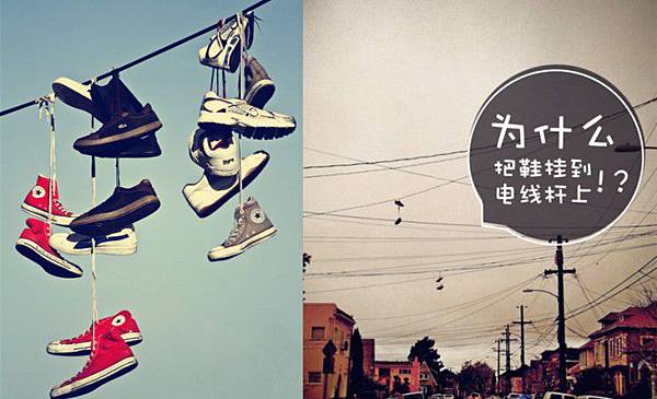 隨後我趕緊就去Google了一下,這種把鞋子掛在電線上的行為叫Shoefiti,是Shoe(鞋子)和Graffiti(塗鴉)兩個詞的組合,這個現像不止美國有這個現象,在德國,英國,澳大利亞等等都有鞋子掛在電線桿或者樹上的情況發生。但是大多數出現在人員混雜,治安比較亂的地區,對於把鞋掛在電線桿上,不同地區有不同的說法,現總結如下。