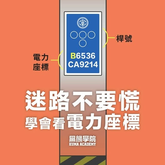 若是電力基座,記得完整報出圖上英數組成的9或11碼字串,救援人員才能輸入「電力座標轉換與定位系統」或是「台電圖號座標定位系統」查詢到通報地理位置。