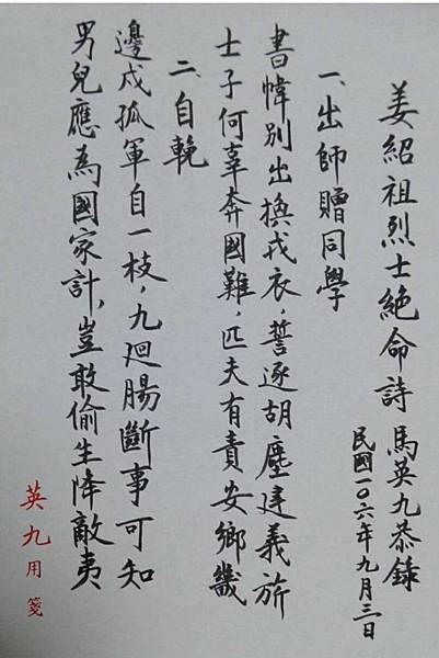 四、為人正直不苟且,不貪身怕死,激發全軍愛國意識,眾志成城一心抵抗外侮的果敢表現。