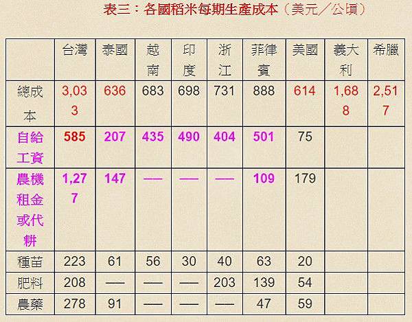表三也顯示:台灣稻米從上游的種苗、肥料、農藥、代耕,一直到下游的碾磨與運銷,成本都數倍於美國、泰國與越南,但是農民的所得卻接近泰國與越南。這造成一個怪現象:跟農民有關的人(種苗、肥料、農藥、代耕、碾磨、運銷與農業行政、學術研究)都豐衣足食或衣食無虞,但是農民的生活卻日益艱困,乃至無以為繼。