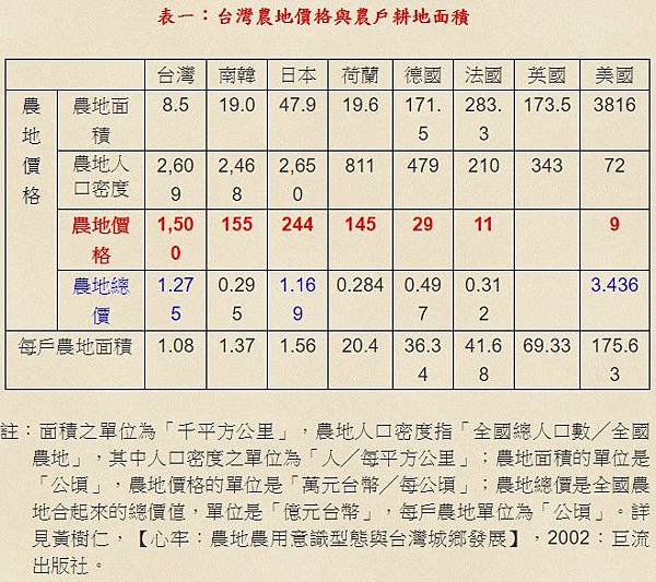 註:面積之單位為「千平方公里」,農地人口密度指「全國總人口數╱全國農地」,其中人口密度之單位為「人╱每平方公里」;農地面積的單位是「公頃」,農地價格的單位是「萬元台幣╱每公頃」;農地總價是全國農地合起來的總價值,單位是「億元台幣」,每戶農地單位為「公頃」。詳見黃樹仁,【心牢:農地農用意識型態與台灣城鄉發展】,2002:巨流出版社。
