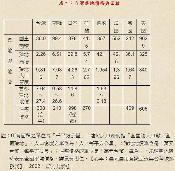 註:所有面積之單位為「千平方公里」;建地人口密度指「全國總人口數╱全國建地」,人口密度之單位為「人╱每平方公里」;建地地價單位是「萬元台幣╱每平方公尺」;住宅價格的單位是「萬元台幣╱每戶」,未註明地區時表示全國平均價格。詳見黃樹仁,【心牢:農地農用意識型態與台灣城鄉發展】,2002:巨流出版社。