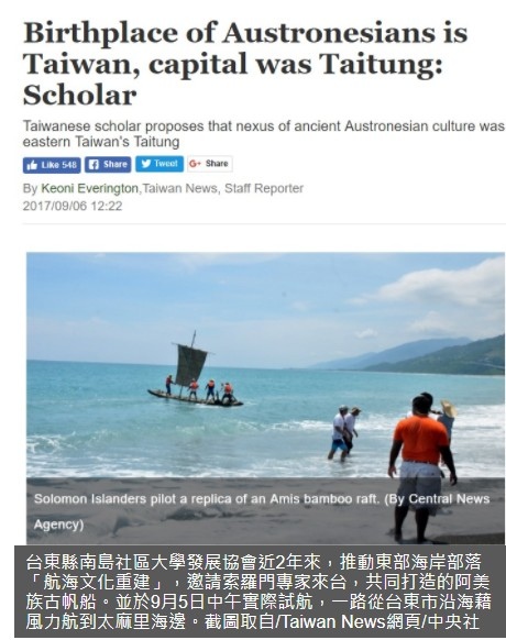 英文媒體《台灣新聞》(Taiwan News),9月6日報導指出,阿美族古代竹筏帆船試航活動,該船隻由台東市沿海藉風力航行到太麻里海邊。學者劉益昌參加該阿美古船重現活動時指出,台灣原住民應該早在4,000年前,就有能力建造航海竹筏帆船;早於日本時代的台灣文獻就記載了相關的打造方法。類似的造船工藝,在50年前的菲律賓、越南,都能發現到。