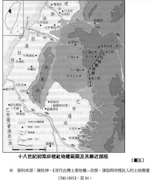 以臺灣南島族群的傳統社會組織而言,大社可視為一個部落的基本單位,乾隆年間的岸裡大社即岸裡九社的基本地域範圍。九社中的岸東社、岸西社、岸南社,合稱岸裡本社。岸東社自稱Diayaodaran,舊址在今臺中縣神岡鄉大社村、豐原社皮里;岸西社自稱Rahododaran,舊址在今臺中縣神岡鄉大社村;岸南社自稱Marivu,舊址在今臺中縣神岡鄉大社村;岸墩社卅葫蘆墩社,自稱Rutura-toru;位於葫蘆敦社東北,自稱Barlafon的翁仔社,又稱翁社、岸翁社,其地域範圍接連舊址在朴仔口的樸仔籬社,包括南坑口(今豐原市北陽、南陽、中陽、東陽、陽明等里)一帶,附近也是溪洲新社仔(可能為岸裡社群於19末世紀形成的新社)的範圍;麻裡蘭社自稱Balithan,原址在社皮庄(今豐原市社皮里),與西勢尾社(在今大社村之西)相當接近。其活動領域包括今神岡鄉社口、社南、三角、豐洲、神洲、溪洲等。咸豐年間開始在鯉魚潭(今苗栗縣三義鄉鯉魚村)建立新居,惟同治年間,原居地仍有麻裡蘭社人留住;西勢尾社自稱Bauwata,19世紀末