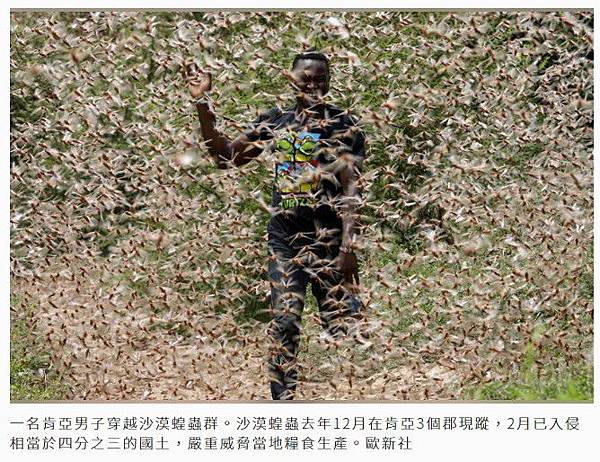 而在非洲目前也出現據說有數千億隻的大量蝗蟲。由於蝗蟲會將採收前的農作物全部吃光,因此外界正高度擔心會發生糧食危機4千萬隻蝗蟲入侵阿根廷後南下 當地農作物嚴重受害 https://bit.ly/383N2Kb
