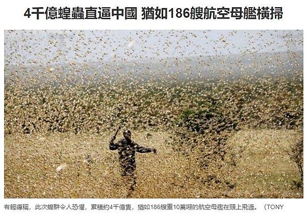 中共官媒稱,沙漠蝗蟲入侵風險大大加劇。一旦爆發,將直接威脅農業生產、破壞生態環境,影響正常生活秩序,甚至成為引發社會危機的公共事件。直接威脅糧食安全。