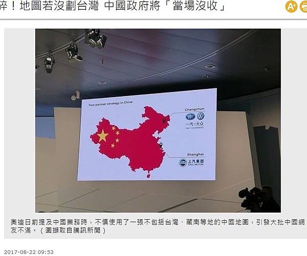 奧迪日前提及中國業務時,不慎使用了一張不包括台灣、藏南等地的中國地圖,引發大批中國網友不滿。(圖擷取自騰訊新聞)