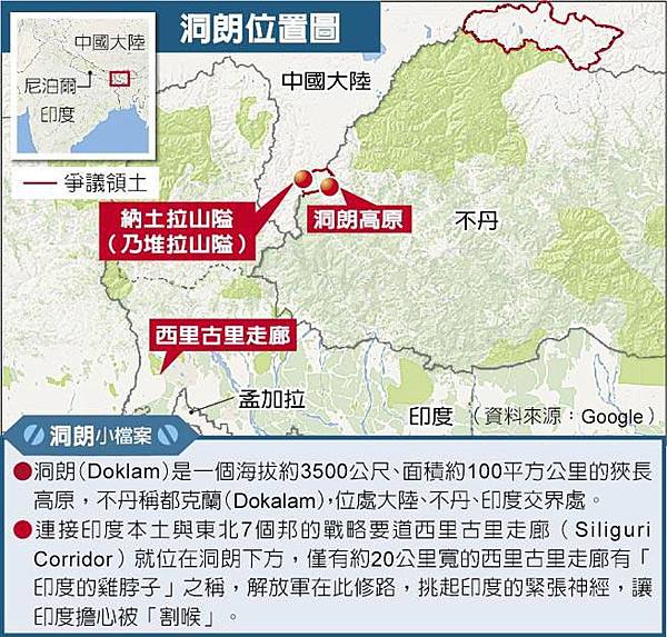 短短1個多月,中印對峙急劇升溫。事件始於大陸6月16日開始在洞朗高原修築道路,印度擔心大陸藉修路之名加強洞朗戰備,以居高臨下態勢「掐住」有印度雞脖子之稱的「西利古里走廊」(Siliguri Corridor),印度為此還從錫金派遣邊防軍進駐,與解放軍對峙至今。