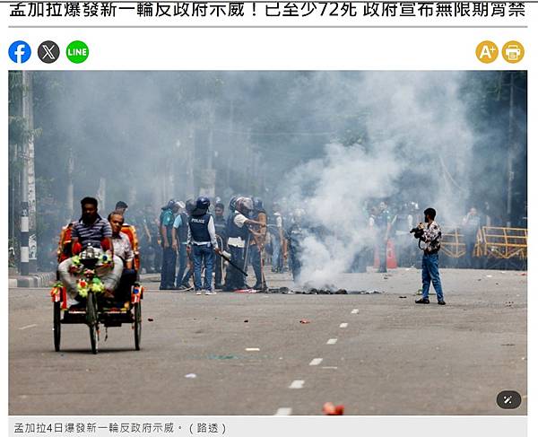 孟加拉爆發新一輪反政府示威!已至少72死 政府宣布無限期宵禁 - 國際 - 自由時報電子報