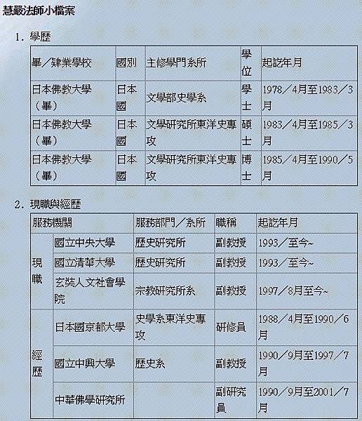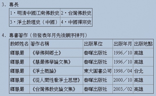 慧嚴法師--弘法德相 慧嚴法師生於民國三十五年(1946),是高雄縣鳳山市人,在十八歲(1964)時皈依煮雲法師,二十歲(1966)即披剃出家。出家、壽山佛學院(即日後佛光山東方佛教學院)畢業後,首先任教於屏東市東山寺東山佛教學院,再到台北佛教智光高等職業學校服務。民國六十七年(1978)赴日深造,民國七十九年(1990)以「清代知識分子的佛教信仰」,取得日本經都佛教大學文學博士學位,成為台灣第一位取得日本佛教大學博士學位的比丘尼。學成歸國後翌年晉陞鳳山佛教蓮社住持,並分別任教於中興大學(日本史)、中央大學(台灣佛教史)、清華大學(日文名著選讀),玄奘人文社會學院、圓光佛學研究所、中華佛學研究所。