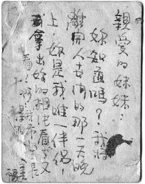 妳知道嗎?我將離開人世間的那一天晚上,妳是我唯一伴侶,我拿出妳的相片看了又看,啊!我希望最……(可能因淚濕,鋼筆字模糊。)