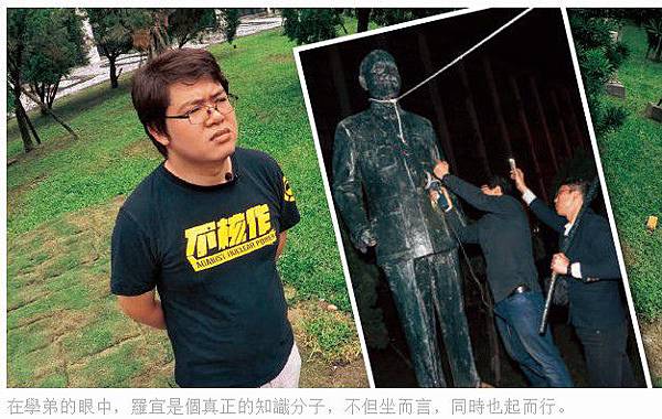 羅宜 20歲 台北人 輔大在學生最近砍銅像成了全民話題,輔大的蔣中正銅像就是我砍的。為什麼要砍學校的蔣介石銅像?民主時代,大學裡面不該再有威權崇拜的象徵。教科書宣傳獨裁者做了多少好事,其實只是把日本人從台灣掠奪的資源,轉換到統治階層的手中。不管是十大建設或是經濟起飛,都是一大群人的功勞,不該歸給某人。我弄來一台砂輪機,半夜偷偷跑去鋸銅像。我沿著腳踝鋸了一圈,用繩子想把銅像拉倒,沒想到裡面有骨架拉不倒。又因為鋸的聲音太大,傳遍整個校園。警察很快就來阻止,把我們帶回警局。學校沒有告我毀損,最後銅像也移除了。我跟另外三個旁觀的同學,被警察以妨礙公務罪移送,這兩天才剛出庭。很多社運人士都有憂鬱症,反抗行動常常是情緒宣洩的出口。我身邊有一些人都自殺,死了好幾個。其中包括我的父親。他上個月剛過世。我從小跟父親算親。他以前投資失敗,當鐵工維生,得了躁鬱症,常常情緒失控,後來跟媽媽離婚。父親年輕時參加社運,我長大後也常跟他學習。這次鋸銅像他也有幫忙挑器材,教我怎麼寫聲明稿。但是父親過不了負債與情緒問題,會跟我借生活費,自殺超過十次。我很珍惜跟他相處的時光,但同時也給我很大壓力。他燒炭死的時候,我並不意外,心理也做好準備。有時我會想自己如果過得不好,是否會步上他的後塵。我是基督徒,耶穌就是他那個時代的抗議者,所以我也跟隨他的步伐。因為我有我的信仰,所以我參加社會運動;因為我參與社會運動,所以我保有我的信仰。社運有爭權奪利的殘酷一面,我只能確保自己是怎樣的人,積極的行我的善。