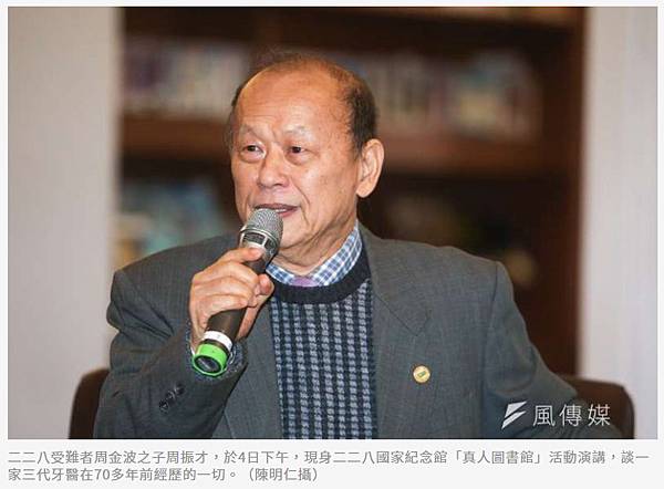 是怎樣的傷痛,讓一名台灣頂尖牙醫死前再三交代家人要把骨灰埋在日本、死也不願回台灣?今(4)日下午,二二八受難者周金波之子周振才現身二二八國家紀念館「真人圖書館」演講,談一家三代牙醫在70多年前經歷的一切。