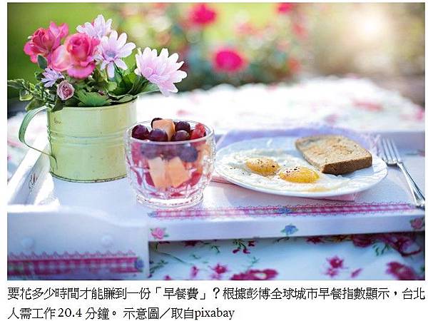 要花多少時間才能賺到一份「早餐費」?根據彭博全球城市早餐指數顯示,台北人需工作 20.4 分鐘。 示意圖/取自pixabay