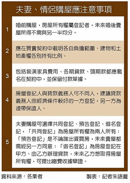 至於貸款問題,徐佳馨表示,多數銀行都不接受房貸「共同貸款制」,銀行只會接受一人出面借款當義務人,有時銀行會要求另一方當連帶保證人,建議借款人由經濟條件較好的一方當,可享有較好的貸款條件,而另一方當連帶保證人,則是考量到未來還款以及分合不定等現實面,若借款人未來無力償還,連帶保證人有優先購買該房屋的權利。