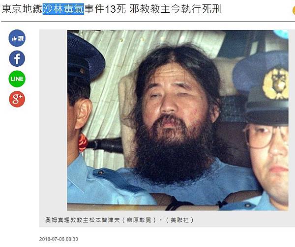 分享東京地鐵沙林毒氣事件13死 邪教教主今執行死刑到Facebook 分享東京地鐵沙林毒氣事件13死 邪教教主今執行死刑到Line 分享東京地鐵沙林毒氣事件13死 邪教教主今執行死刑到Google+