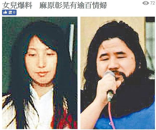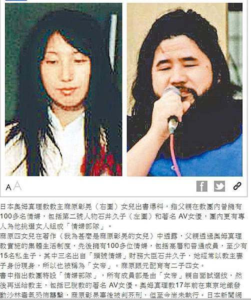 日本奧姆真理教教主麻原彰晃(右圖)女兒出書爆料,指父親在教團內曾擁有100多名情婦,包括第二號人物石井久子(左圖)和著名 AV女優,團內更有專人為他挑選女人組成「情婦部隊」。