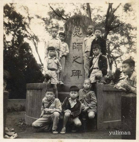 這張照片是我叔叔小時候在瑞穗瑞美國小內的「恩師之碑」前和同學一起拍攝的合照,瑞美國小創立於明治三十八年(1905),是歷史悠久的百年老學校,校內至今仍保留不少日治時期遺留到現在的古物。而這塊恩師之碑為昭和二年(1927)當時的校長中條福安所設立,題字者是當時花蓮相當有名的文人張采香。