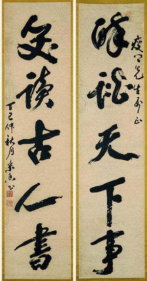 「醉談天下事,笑讀古人書」張采香此幅對聯寫來帶有霸氣,飄忽飛白用筆,應受日本書道影響。