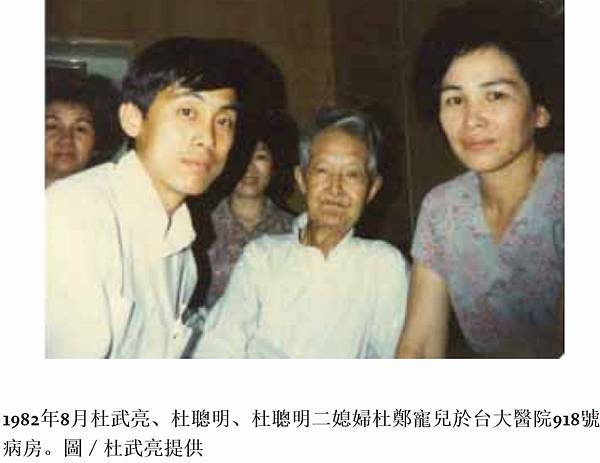 1982年8月杜武亮、杜聰明、杜聰明二媳婦杜鄭寵兒於台大醫院918號病房。圖/杜武亮提供