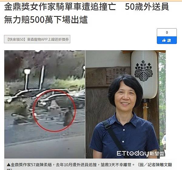 金鼎獎女作家騎單車遭追撞亡 50歲外送員無力賠500萬下場出爐 | ETtoday社會新聞 | ETtoday新聞雲 https://bit.ly/3iGaWlg