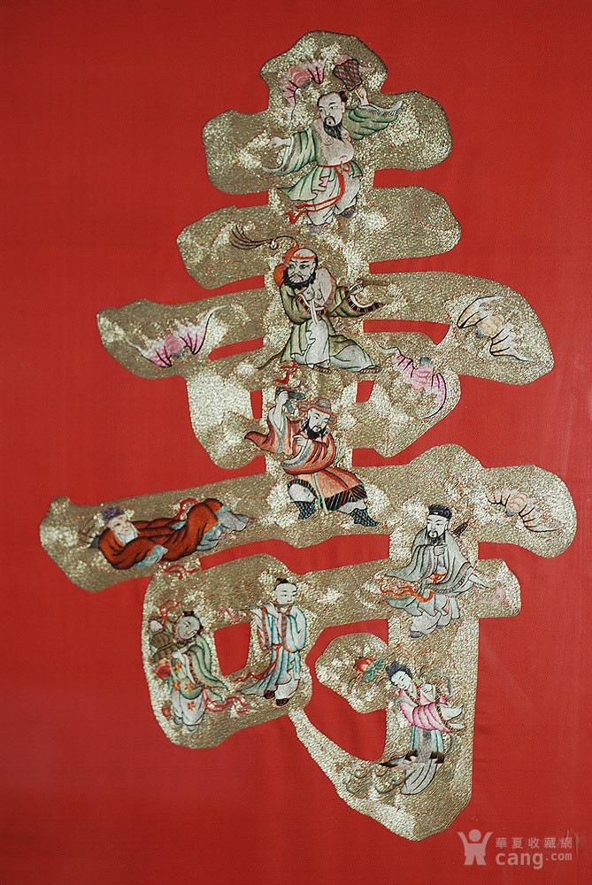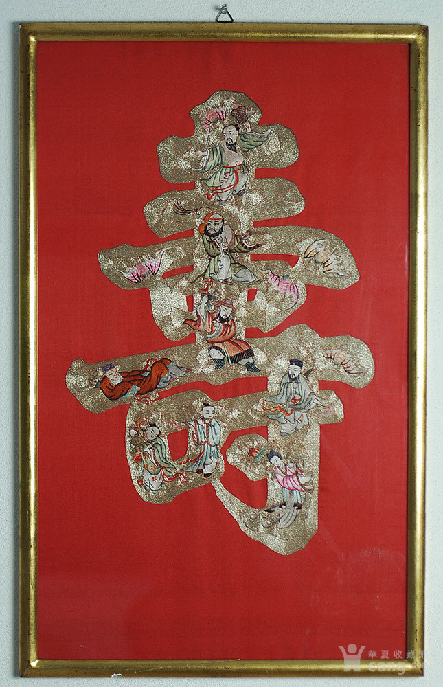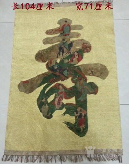 在米色地上緙織一個巨大的“壽”字,在壽字的筆筆划划中,匠人又巧妙地將八仙、西王母、福祿壽三星緙織在字裡行間。瓊樓玉宇的亮麗蘭色中,西王母手捧蟠桃端坐翔鳳之身,背後仙女手執九羽掌扇;天宮下面,福祿壽三星作揖恭祝;自左向右分別為呂洞賓、鐵拐李、漢鍾離、張國老、蘭采和、曹國舅、韓湘子、何仙姑。描繪了每年八仙等眾神仙,前往天宮赴西王母蟠桃大會,為其祝壽的場景。壽字的天頭以金線緙織“天錫純嘏”四個大字。鄭玄箋曰:“純大也;受福說嘏”。故古人稱祝壽為“祝嘏”。整體設色沉穩,圖案喜氣,主體為緙絲工藝,人物眉眼鬚髮則工筆精繪。此幅彩色緙織“壽”圖,將傳說中的仙界蟠桃大會,活靈活現地表現了出來,運用了極為精湛的緙絲工藝,內容統一和諧,具有很高的藝術價值,為極好的廳堂陳設佳作。