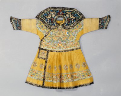 此小朝袍符合清代皇帝袍服的典制,应是清晚期幼年的同治皇帝或光绪皇帝所穿之朝袍。