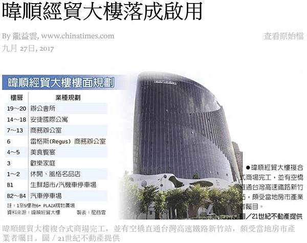 座落台灣高速鐵路新竹站特定區內的暐順經貿大樓昨(27)日落成啟用,成為新竹縣首座聚集商辦、商旅、休閒購物合一的複合式大樓。地上20層、地下4層的SRC、RC造大樓,樓高約99.9米,規劃「6+PLAZA」購物廣場、商辦空間、商旅、觀光住宿與餐飲服務,預料將成為高鐵新竹站區匯集人流的新聚點。