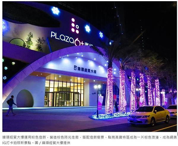 今年9月甫舉辦落成典禮的暐順經貿大樓,12月28日展開6+PLAZA廣場試營運活動,試營運前一週,6+PLAZA廣場以粉色浪漫為主題,打造一座高達9米高的聖誕樹,並運用粉色燈飾,營造粉色時光走廊,搭配燈飾樹景,點亮高鐵特區成為一片粉色浪漫。現場可愛的雪橇、麋鹿、馬車等裝飾,深受大小朋友喜愛,吸引許多民眾駐足觀看與拍照留念,也成為網美IG打卡拍照新景點。