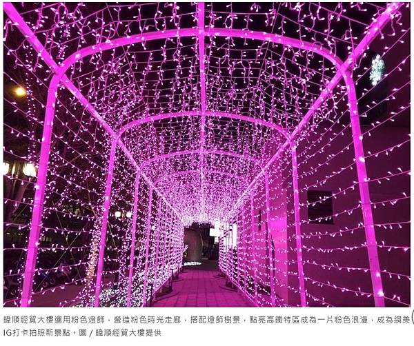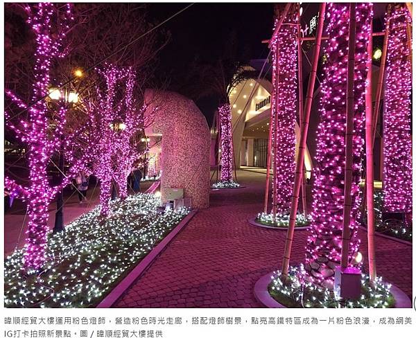 暐順經貿大樓運用粉色燈飾,營造粉色時光走廊,搭配燈飾樹景,點亮高鐵特區成為一片粉色浪漫,成為網美IG打卡拍照新景點。圖/暐順經貿大樓提供