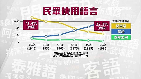 台語是台灣重要語言文化資產,現在年輕人卻是越來越多人不會說台語。根據調查顯示,75歲的長輩會講台語的超過71.4%,25歲會講台語的年輕人卻只有22.3%。行政院長蘇貞昌也強調,這問題確實嚴重!