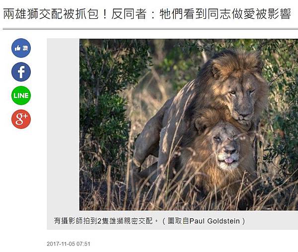 分享兩雄獅交配被抓包!反同者:牠們看到同志做愛被影響到Facebook 分享兩雄獅交配被抓包!反同者:牠們看到同志做愛被影響到Line 分享兩雄獅交配被抓包!反同者:牠們看到同志做愛被影響到Google+
