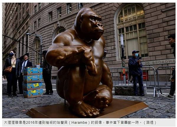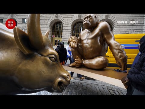 〔即時新聞/綜合報導〕美國紐約「華爾街銅牛(Charging Bull)」是華爾街的象徵性地標,象徵著1987年股災後,美國經濟的韌性以及美國人民的力量。不過本月18日,銅牛對面突然出現一隻約213公分的大型猩猩銅像,大猩猩凝視著銅牛,並且銅牛身邊散落了1萬根香蕉,暗示銅牛象徵著富人、大猩猩代表掙扎求存的數百萬普通人。