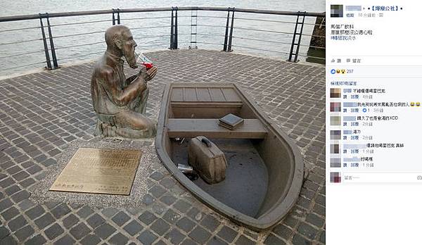 新北市淡水區河岸旁,有一尊馬偕博士跪地禱告的藝術銅像,卻被搞笑惡整,一名網友在《臉書》社團「爆廢公社」轉po照片,馬偕銅像雙手上竟然被放了一杯星巴克飲料,吸管還就在他嘴巴處,看起來就像是馬偕正在喝飲料一般,網友表示,「是誰那麼沒公德心啦」。