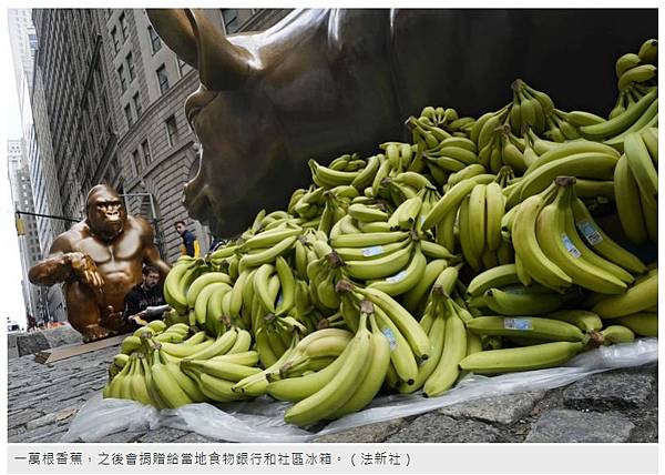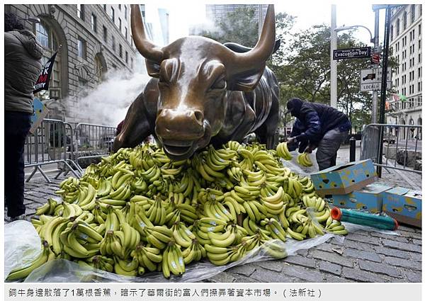 華爾街銅牛與「大猩猩」對視!散落萬根香蕉控訴貧富差距