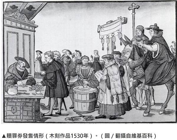 ▲贖罪券發售情形(木刻作品1530年)。(圖/翻攝自維基百科)