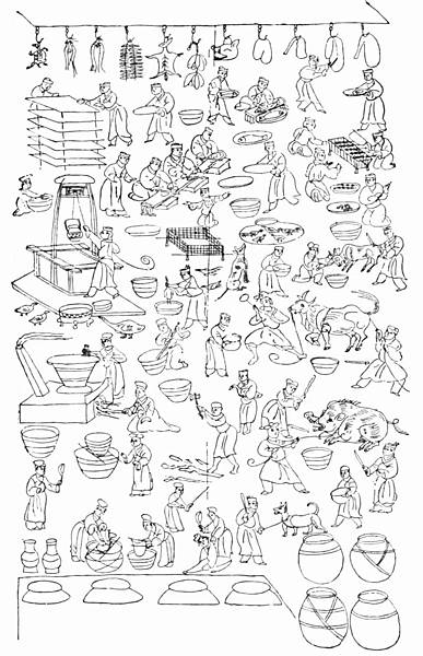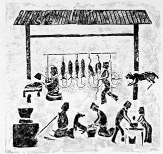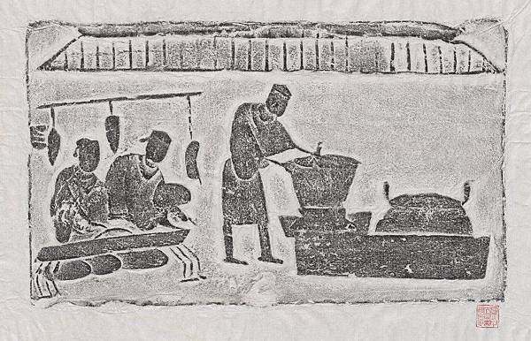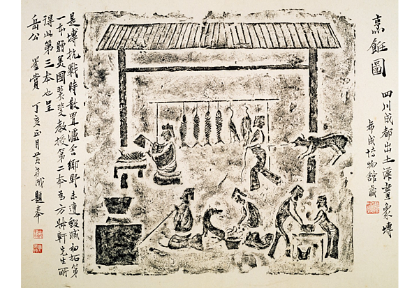 四川成都出土漢畫像磚拓本。此幅描繪漢代庖廚景象,魚鴨滿架,顯示出人們烹飪時忙碌的實況,有的人在洗菜,有的在切菜,有的則負責升火烹食,亦可廚房內兩隻家犬,畫面形象鮮活生動。