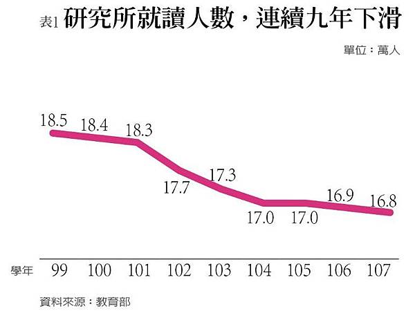 99學年度(2010年),研究所就讀人數超過18.5萬人,但大學生瘋讀下,愈來愈多人懷疑研究所的價值,導致研究所就讀人數於107學年度(2018年)跌至16.8萬人,近十年少了1.7萬人,減幅達9%。