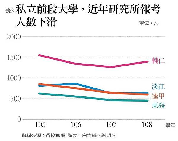 但私立大學碩士班的報考人數就大幅走滑了,連私立老牌名校也無法倖免,二線私校更出現前所未有的招生危機(見表3)。