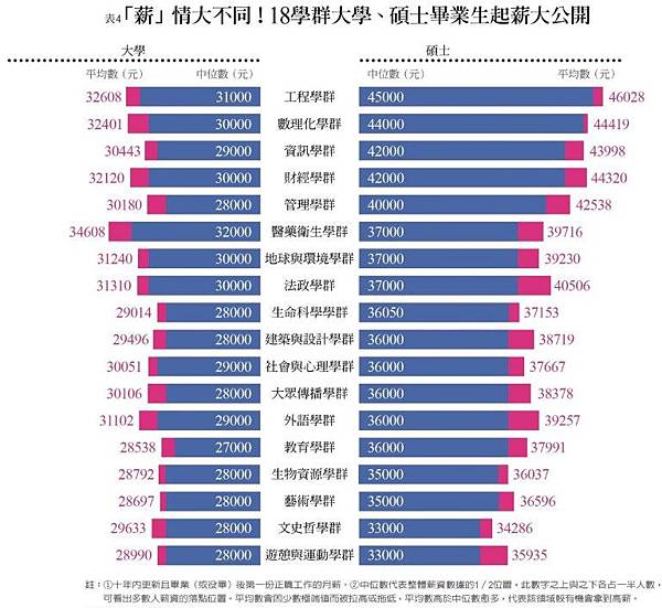 《遠見》調查顯示,18學群中,碩士起薪中位數最高的前五名,分別是工程、數理化學、資訊、財經、管理。工程高達4.5萬,數理化緊追在後,有4.4萬;熱門的資訊、財經都是4.2萬;管理也有4萬。