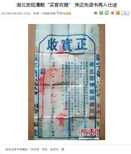 中國新聞網報導,趙姓男子說,這張「買官收據」是他在整理家譜時意外發現,為棉紙質地,長5.8公分、寬2.8公分,正上方印有「正實收」三個大字。收據內文排列整齊,雖然已有超過百年歷史,但文字仍清晰可辨,詳細紀載了趙家先祖趙文庵捐款換官的緣由。