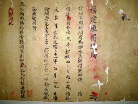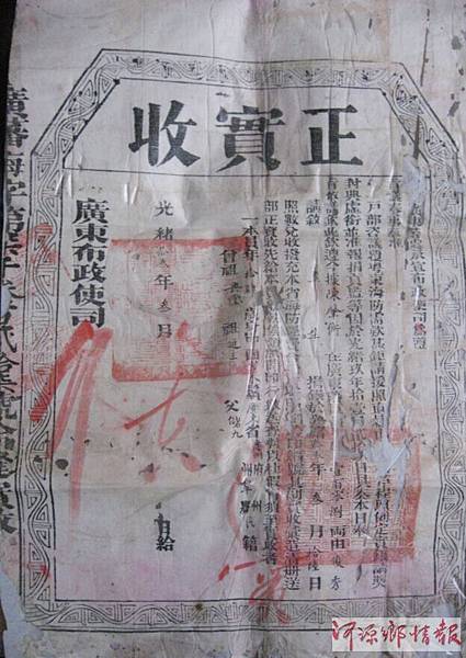 近日,在和平縣林寨古村司馬第,有村民發現了一張寫有“大清光緒十三年廣東藩處承宣布政使司頒發”等字樣的正實收。證書為絹質紙,長72厘米、寬40厘米、字體黑色、印章鮮紅,文外飾有花邊,歷經一百多年後﹐現在已有破損。正實收裡的寫著:“廣東藩處承宣布政使司﹐為遵旨議奏事﹐奉準戶部諮議复﹐粵東海防需款甚鉅﹐請授照直隸山東海防章程﹐照例定實銀請獎封典虛銜﹐並準報捐員監等。因於光緒玖年拾一月貳拾日﹐具奏本日奉旨依議﹐欽此。欽遵今據陳肇衡在廣東藩庫報捐銀一佰零捌兩﹐由俊秀請敘監生﹐捐銀於光緒拾三年三月拾陸日﹐照數兌收撥充本省海防經費﹐給照例給印編號﹐其副實收﹐累造清冊﹐送部正實收﹐先給本員收執矣。領照時﹐即行繳送查對﹐以杜假冒。須至實收者﹕一本員年拾肆歲﹐身中﹐面紫﹐小須﹐廣東省惠州府(州)和平縣(州)民籍﹐曾祖興堂﹐祖近三﹐父儲九。光緒拾三年三月拾陸日給廣東布政使司。”正實收中縫留有“廣藩海事第貳千三佰貳拾柒號合縫實收”的半邊字樣。