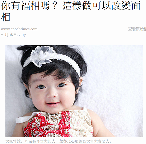【大紀元2017年07月18日訊】(大紀元記者周慧心綜合報導)有些人一眼看去就給人慈眉善目的感覺,而有些人一看就覺得不善。在面相學中,有一句名言叫做「相由心生」,即是說有什麼樣的心境,就有什麼樣的面相。那麼什麼樣的面相是福相?怎樣才能變得更有福相呢?