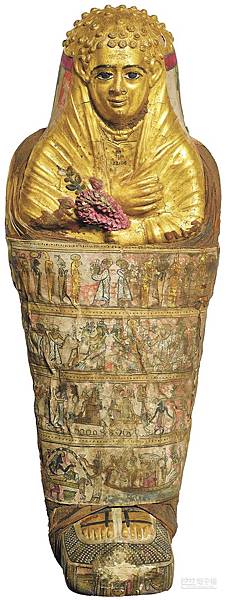 「來自哈瓦拉的兒童木乃伊」是羅馬時期的埃及木乃伊,有金色面具,手上則握著花朵。(時藝多媒體提供)