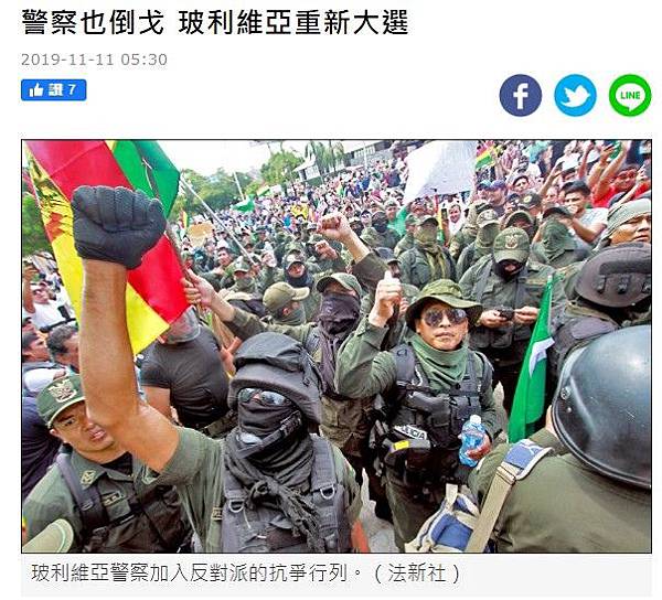 玻利維亞十月總統大選傳出作票爭議,反對陣營持續抗爭至今。憤怒的民眾九日闖入兩家官方媒體驅逐員工,強迫斷訊,原本駐衛總統府的菁英警隊也加入示威行列。面對龐大壓力,玻國總統莫拉萊斯(Evo Morales)十日宣布,將尊重美洲國家組織(OAS)的調查報告,重新舉行大選,並將陷入舞弊疑雲的選舉委員會成員撤職。警察也倒戈 玻利維亞重新大選 - 國際 - 自由時報電子報 http://bit.ly/2QcCUb0