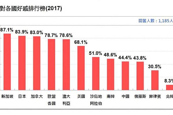 如果根據「淨好感」排行榜,台灣人最喜歡的國家仍然是新加坡(80.9%)、其次是加拿大(79.2%)、第三是歐盟(72.3%)、第四是澳大利亞(72%)、第五是日本(71.9%)、第六是美國(43.8%),以下依序是沙烏地阿拉伯(24.8%)、俄羅斯(9.9%)南韓(6.9%)、中華人民共和國(-3.0%)、菲律賓(-26.8%)、北韓(-73.3%)。