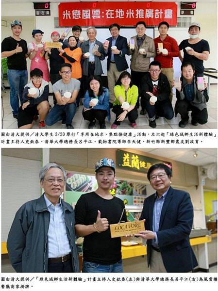清華大學學生支持在地小農直送在地良米的行動,今(3/20)日由清華總務長呂平江、「綠色城鄉生活新體驗」計畫主持人史欽泰院長共同為6間合作餐廳掛牌,宣告活動起跑。主辦團隊今天也公布集點推廣活動,邀請更多清華師生到風雲樓餐廳「享用在地米、集點換健康」,學生會長張翊也現身支持;集點推廣活動從3月20日開始到至4月7日止,凡於風雲樓自助餐、益蘭素食、漢城、越好食堂、倆小食、也果蔬食等6間合作餐廳,消費一份餐點,即可獲得1點,集滿8點即獲40元優惠卷。