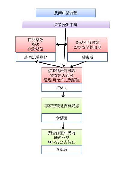 農藥使用的許可有一定法定程序,並不會依據廠商要求來訂殘留標準。廠商提出申請之後繳交相關的試驗費用,就委由農委會的試驗單位進行相關測試並編寫報告,之後再由農委會開專家審查決定是否通過,若通過,就再訂定相關的殘留標準,轉交衛福部審議,如果沒有疑慮,之後衛福部就會提出預告,60天內若無異議,就正式公告。