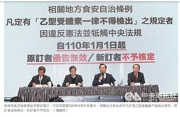 含萊克多巴胺美豬去年開放進口,行政院民國109年12月31日宣布,相關地方自治條例凡訂有乙型受體素不能檢出規定,原訂者函告無效、新訂者不予核定。5縣市議會認有違憲之虞,聲請釋憲,但憲法法庭今天判決行政院規定合憲。