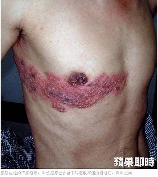 特別的是,病毒隨著感覺神經蔓延至皮膚表面,大部分出現在胸部、腰部、大腿等部位,順著神經節分布狀況而擴散。